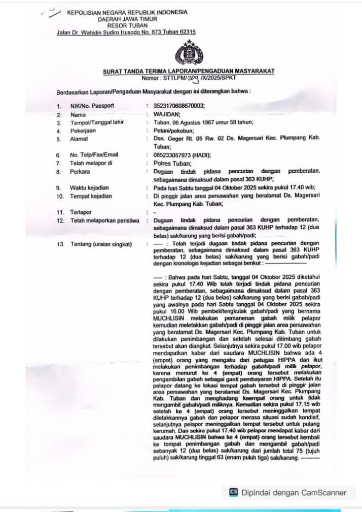 Tuban,Jawakini.com– Suara kekecewaan mulai menyeruak dari Desa Magersari, Kecamatan Plumpang, Kabupaten Tuban. Kasus dugaan tindak pidana pencurian gabah yang dilaporkan oleh seorang warga sepuh, Mbah Wajidan, sejak awal Oktober 2025, hingga kini belum menunjukkan kejelasan penanganan dari Kepolisian Resor Tuban.