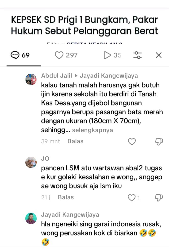 BOJONEGORO,Jawakini.com – Kontroversi terkait insiden penjebolan pagar di Desa Prigi, Kecamatan Kanor, Kabupaten Bojonegoro, kini meluas hingga ke platform media sosial TikTok, memicu perdebatan sengit dan polarisasi pandangan di kalangan warganet. Namun, pusaran polemik ini telah disusupi oleh narasi yang diduga merusak, yang diarahkan kepada profesi Lembaga Swadaya Masyarakat (LSM) dan jurnalis.