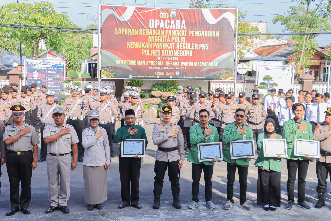 Bojonegoro,www jawakini.com – Kapolres Bojonegoro, AKBP Afrian Satya Permadi SH,SIK,MIK memberikan penghargaan kepada enam warga berprestasi di Bojonegoro dihalaman Mapolres Bojonegoro (29/9/2025). Mereka terdiri dari Sulkhan dari Ponpes Al Rosyid dan empat mahasiswa UNUGIRI yang berprestasi di bidang keselamatan lalu lintas.
