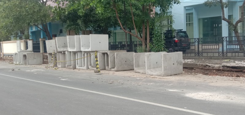 Pantauan awak media di lokasi pada Minggu (26/10/2025) menunjukkan adanya sejumlah tumpukan material “U-Ditch (diduga merujuk pada U-Ditch atau sejenis beton precast) yang tidak mencantumkan label atau identitas pabrikan asalnya.