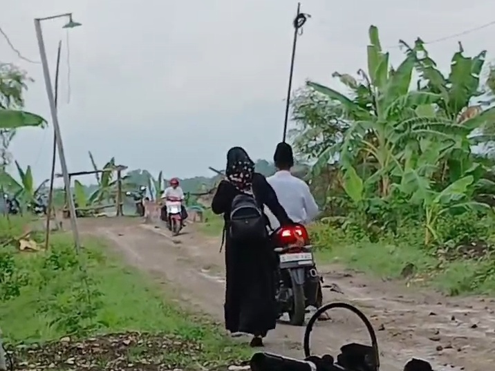 menunjukkan betapa sulitnya pengendara, termasuk ibu-ibu yang membawa beban belanjaan, melintasi jalur becek yang rawan kecelakaan. Bahkan, tampak seorang penumpang terpaksa turun dan berjalan kaki, menuntun motor, karena jalan terlalu licin untuk dilewati berdua.