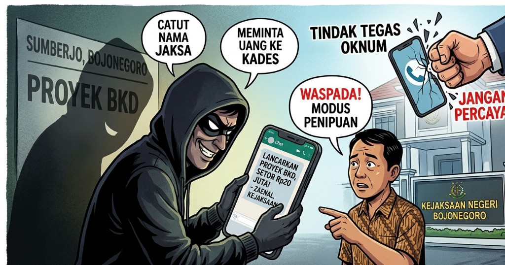 BOJONEGORO,Jawakini.com – Integritas institusi penegak hukum kembali diuji oleh ulah oknum tidak bertanggung jawab. Para Kepala Desa (Kades) di wilayah Kecamatan Sumberjo kini tengah dibayangi teror penipuan yang mengatasnamakan Kejaksaan Negeri (Kejari) Bojonegoro. Dengan dalih “pengamanan” proyek Bantuan Keuangan Desa (BKD), pelaku secara terang-terangan memeras para pejabat desa.